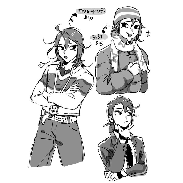 - description: (who you want me to draw, full-body, thigh-up, or bust?, pose/interaction, expressions, etc.)